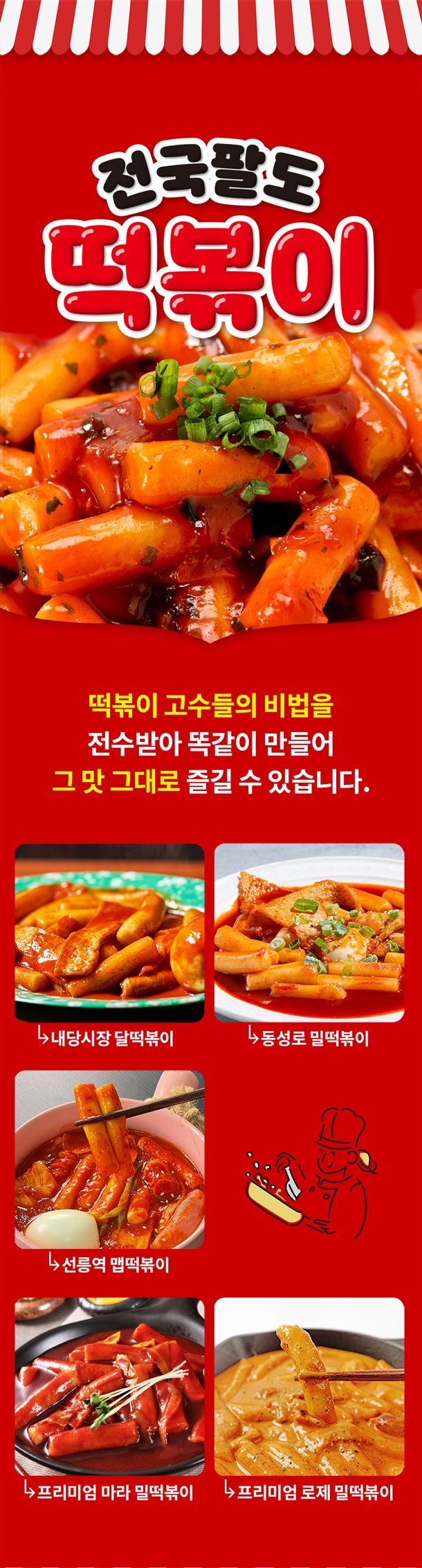 한번 맛보면 자꾸만 땡기는 그 맛! 전국시장 맛집 떡볶이! 떡볶이 고수들의 맛부심! 맵단의 맛의 최강조합! 전국 팔도의 맛있는 떡볶이를 다 가져왔어요~ 떡볶이 고수들의 비법을 전수받아 똑같이 만들었습니다!