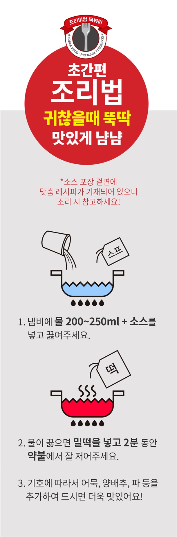 냄비에 물(200ml~250ml)과 떡볶이 스프를 넣고 끓여주세요
