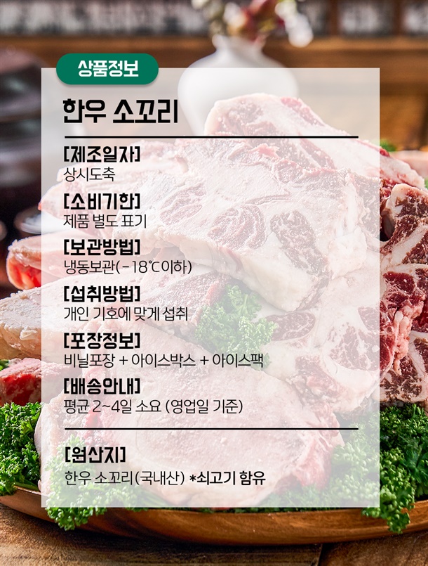 진짜 우리 한우만을 사용한 한우로 더욱 고급스럽고 깊은 맛을 자랑해요~ 꼬리 곰탕, 꼬리찜 등 다양하게 요리 가능해요~ 쫄깃한 식감과 담백한 국물이 일품입니다 ㅎㅎ