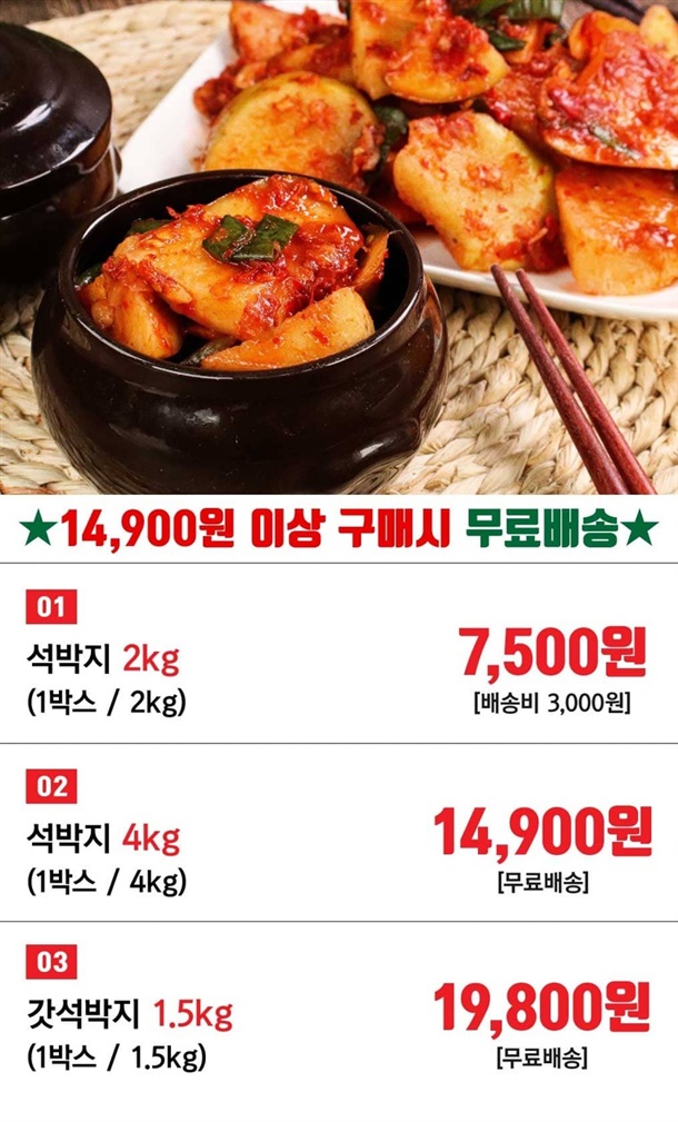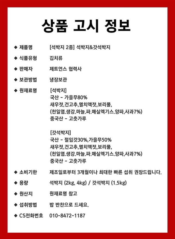 구성 및 용량: 석박지 (2kg, 4kg) / 갓석박지 (1.5kg)
