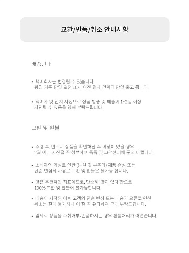 · 구매자가 배송지 주소를 잘못 기입한 경우, 반송/재발송 모두 택배비를 부담하셔야 합니다. (꼭 정확한 주소를 기입해 주세요)