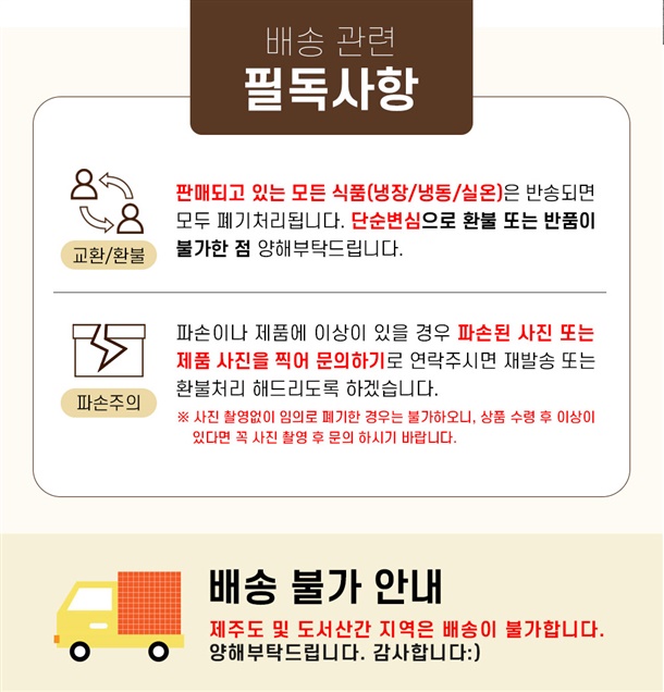 · 구매자가 배송지 주소를 잘못 기입한 경우, 반송/재발송 모두 택배비를 부담하셔야 합니다. (꼭 정확한 주소를 기입해 주세요)